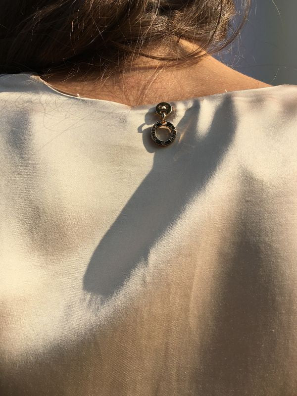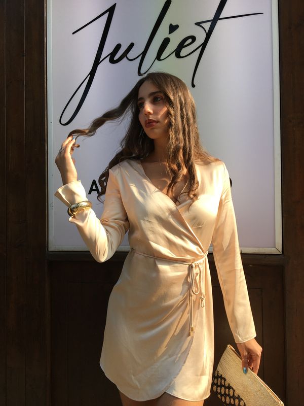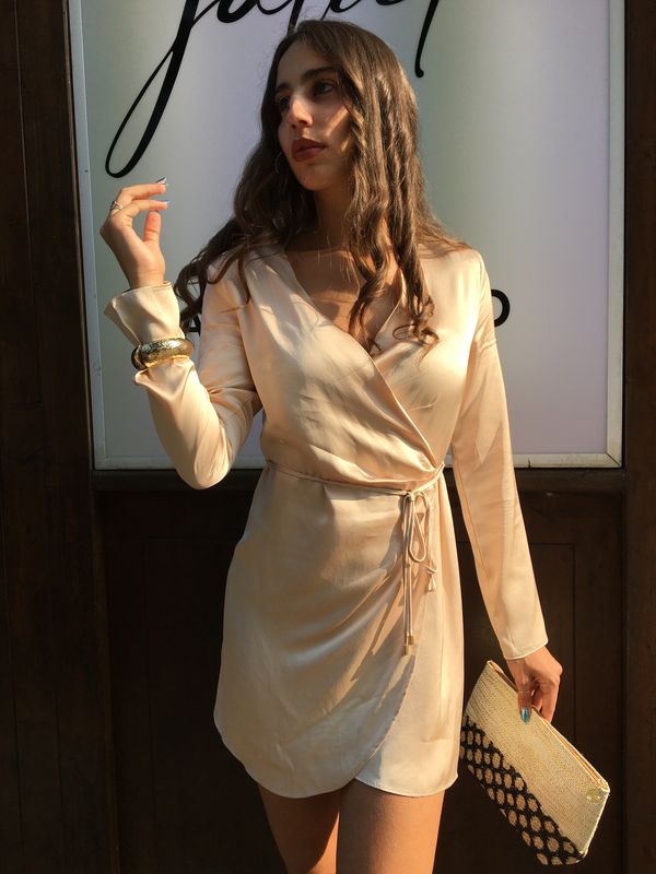 Abito in raso. Manica lunga. Incrociato con gonna a portafoglio. Chiusura con laccetto.
