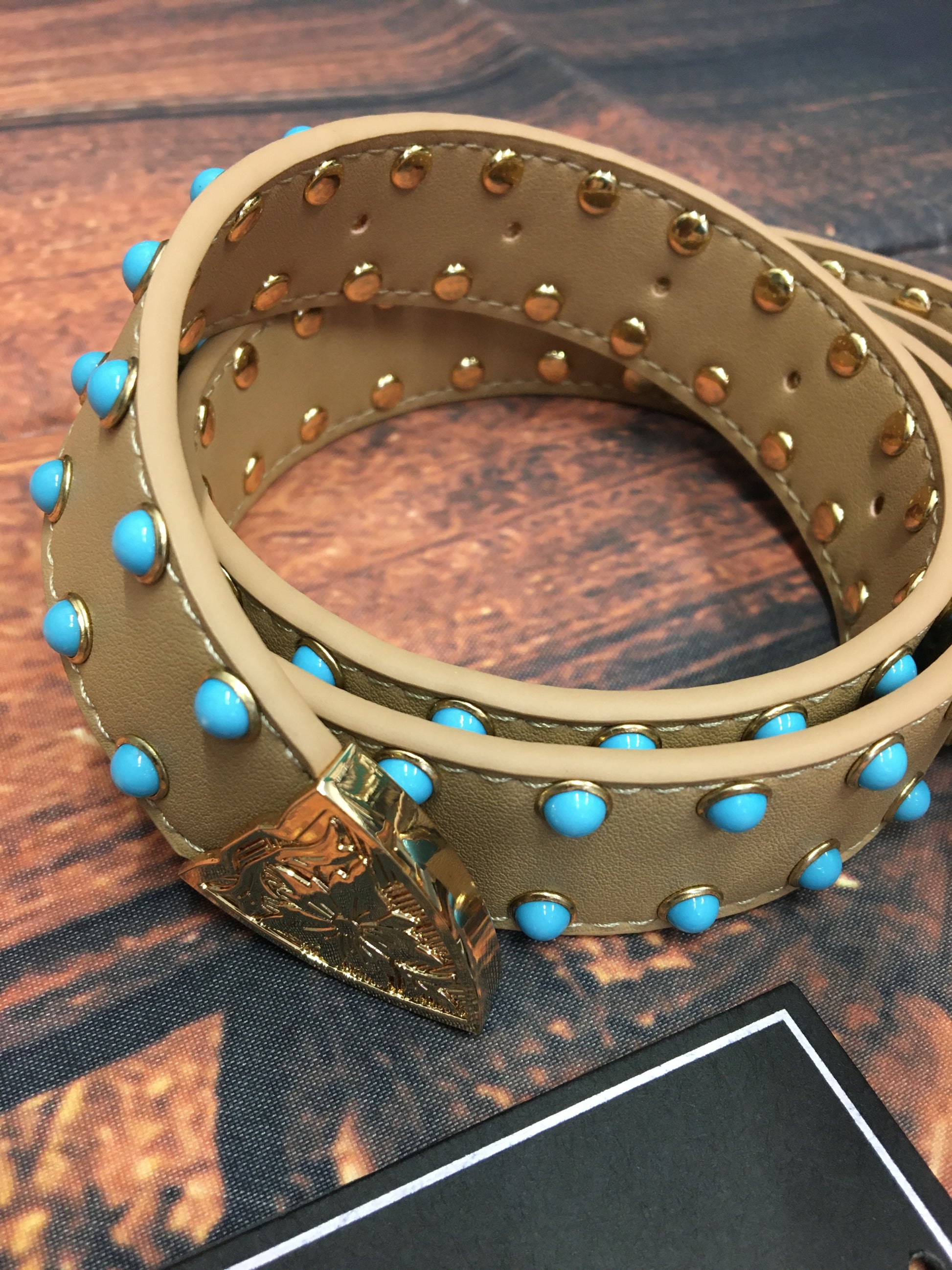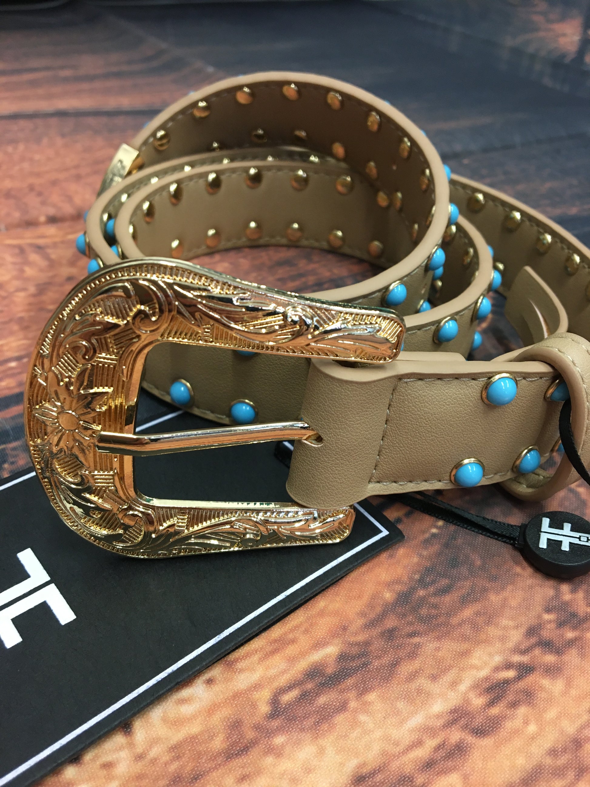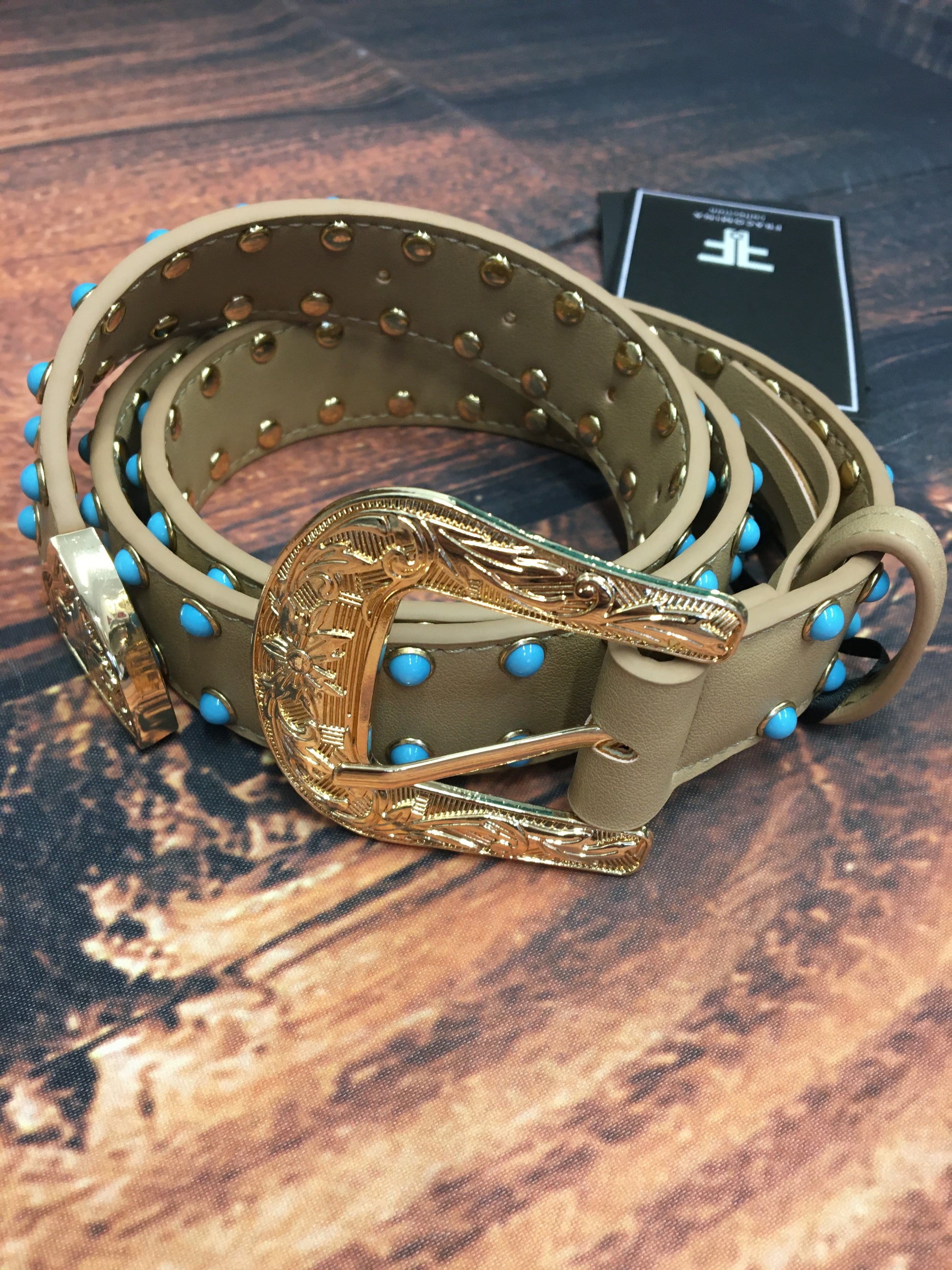 CINTURA BEIGE CON DETTAGLI DORATI E BORCHIE TURCHESI.