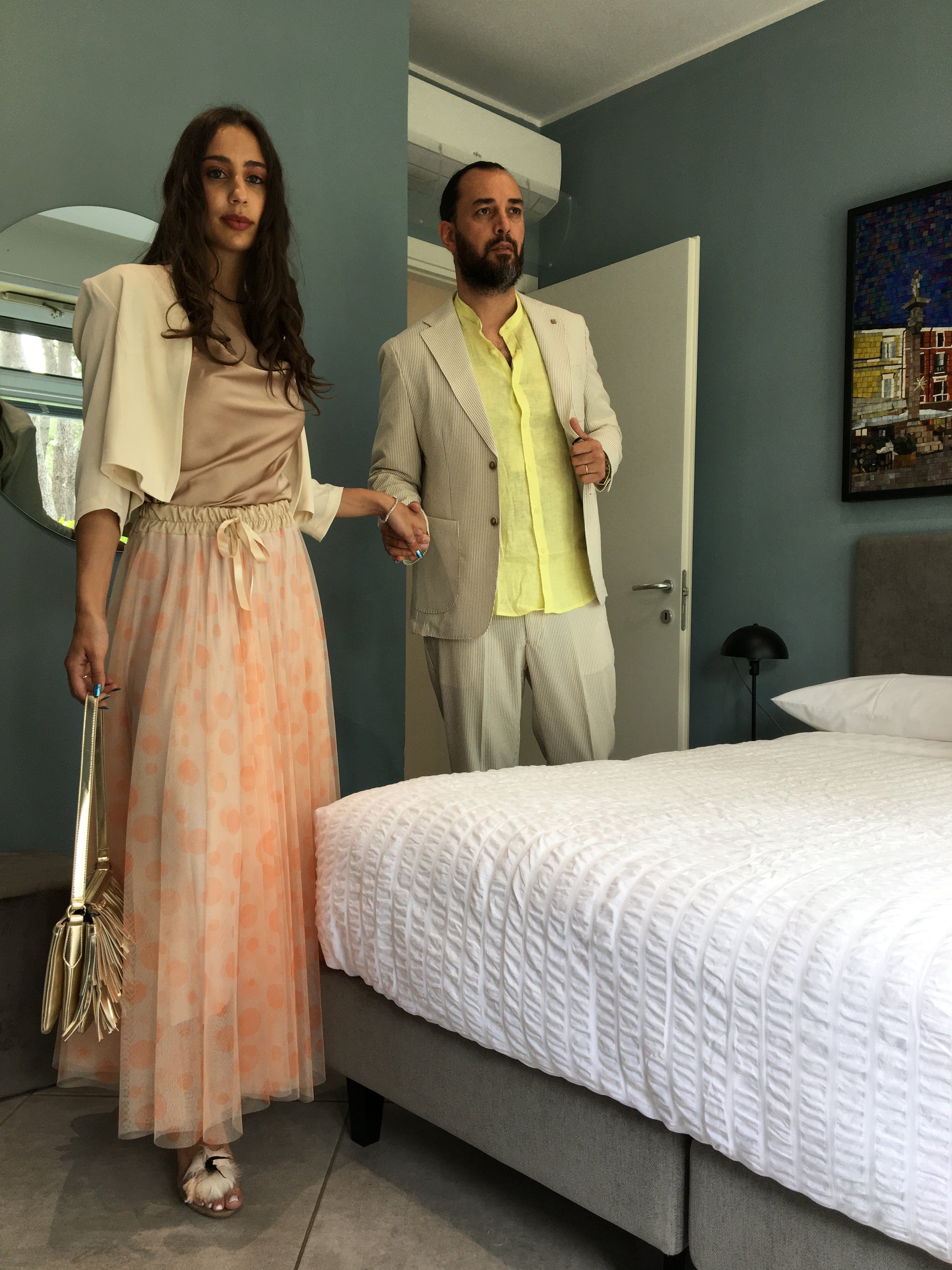 Gonna ampia midi. Tulle con pois arancioni. Elastico in vita con fiocco beige in raso. Foderata. Taglia Unica