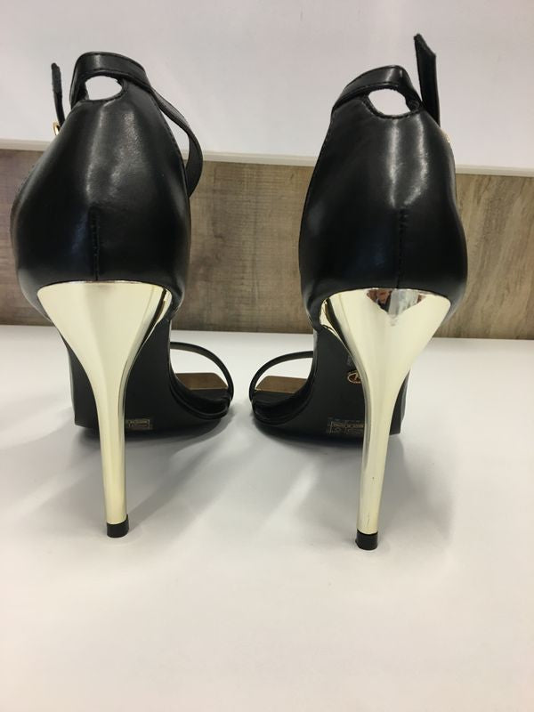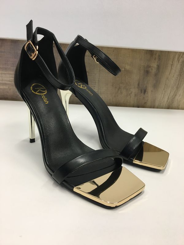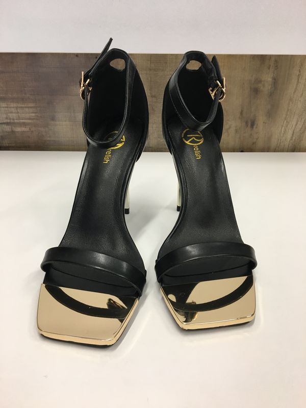 Sandali in ecopelle neri fascia davanti. Punta quadrata. Tacco e punta in metallo dorato. Chiusura con cinturino. Tacco 10 cm.